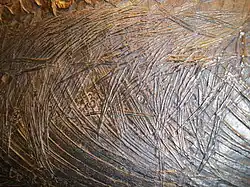 In 1985, paleontological work began at a site known as Sasso Caldo (meaning 'warm stone')[1]: 140  on the Italian side of Monte San Giorgio.[2] This site is located about 800 metres (2,600 ft) above sea level, and was fairly easy to reach. The rocks of this quarry were unmodified by faulting[1]: 140  and consisted of layers of oil shale and dolomite pertaining to the geological unit known as the Besano Formation.[3] The excavation at Sasso Caldo is the longest-lasting excavation that was conducted at Monte San Giorgio,[1]: 140  and was part of an operation organized by the Milan Natural History Museum, with the excavation performed by the Gruppo Paleontologico di Besano, a volunteer group.[2] In the spring of 1993, while extracting a block of dolomite containing the skeletons of a pair of mixosaurid ichthyosaurs, a piece of shale from the layer below broke loose. Preserved within this piece of shale from bituminous level n. 65[2] were the parts of the jaws of a large ichthyosaur. The rest of the skeleton of this ichthyosaur was extracted through the following summer by collecting the entire rock layer it was preserved in. The shale was exposed by using sledgehammers, wedges, and a jackhammer to clear out the dolomite above it, then divided into slabs and extracted with less forceful tools. Being rather fragile, the shale often broke during the excavation.[1]: 140–141