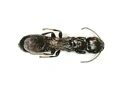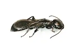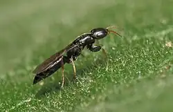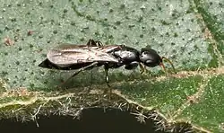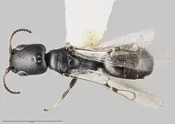 Bethylids are known as flat wasps for their generally compressed and flattened appearance, a trait which is especially pronounced in females and may aid in nesting. Females of most species share a similar flattened, elongated appearance with a roughly oblong head and forward-set compound eyes. Adult females may be winged or apterous, a trait which can vary between species and even between females within the same species.[1] Males are always winged. Like females, males of all species look similar, but they are less flattened and have smaller heads. Females are larger than males of the same species. Most adult bethylids are two to five millimeters in length, though some species can grow to over 10 millimeters.[4] Because of their small size and similar appearances, identifying bethylids to species is difficult without a microscope and expert knowledge.