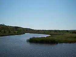 While most sources indicate the river rises as the outflow of Green Lake in southwestern Grand Traverse County, some consider it navigable immediately south of US-31 from Tullers Lake into Green Lake. Another tributary of the river flows directly out of northern Duck Lake and into northern Green Lake, connecting with the aforementioned Tullers Lake Outlet. Although not considered part of the Betsie River today, older maps of the area do say so.[4] Green Lake straddles the boundary between Grant Township on the south and Green Lake Township on the north between Karlin and Interlochen. Several nearby lakes, including Duck Lake and its tributaries, drain into Green Lake.