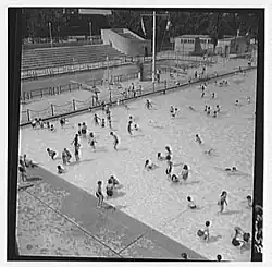 Construction for some of the 11 pools began in October 1934.[40][38] Even though there was already a pool at Betsy Head Park, Moses described its existing pool facilities as "an antiquated tank" that contained no filtration facilities; he proposed to refurbish it entirely as part of the WPA initiative.[19][20] The existing field house largely remained intact, except for some modifications to make way for an enlarged pool. The field house's lockers were replaced by baskets, and its interior was expanded so that 4,660 bathers per day could use the facilities, rather than 4,000.[41] By mid-1936, ten of the eleven WPA-funded pools were completed and were being opened at a rate of one per week.[33] Except for the Betsy Head Pool, each opening featured elaborate performances attended by La Guardia.[41] Betsy Head Park's pool was the ninth to open citywide.[42][43][a] On August 7, 1936, Betsy Head Park's pool area opened without any ceremony or the mayor in attendance; over eight hundred children spread the news of the opening by word of mouth. The opening was arranged at the last minute, and the diving and wading pools were not yet complete.[44][45][46]