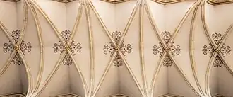 A new shrine for St John was ordered from Roger de Faringdon of London in 1292,[9] to which the saint's remains were translated on 25 October 1307. Collections for further rebuilding were resumed in 1308, and work on the nave had begun by 1311. The architectural style current in England had developed into something much different from the Early Gothic displayed in the first part of the rebuilding; the new style is referred to as Decorated. More structurally daring, more richly decorated forms merge with the earlier, simpler forms in the nave of Beverley Minster, in an effort both to respect the older work and to bring it up to date. Building on the nave was ongoing in 1334, and may have been halted by the Black Death in 1348 as in many other instances across England.[10]