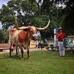The longest reigning Bevo was Bevo XIII, which was supplied to the university by John T. Baker, owner of the Sunrise Ranch in Liberty Hill, Texas.[4] Baker is past president of the Texas Longhorn Breeders Association of America and serves as a judge in its competitions. Bevo XIII, originally named Sunrise Express, was a champion steer at the age of 3, before becoming the UT mascot.[5] Bevo XIII became the mascot in 1988 and served 16 seasons on the sideline.[6][7] He presided over 191 UT football games and attended the first inauguration of President George W. Bush in 2001.[5] During his tenure, he presided over four (1990, 1994, 1995, 1996) conference football championships and a Heisman Trophy award for Ricky Williams. Bevo XIII was the winningest Bevo in UT history, and was replaced by youth grand champion Sunrise Studly, becoming Bevo XIV, at the September 4, 2004 football game versus the University of North Texas. It was the only time that two Bevos have ever appeared at the same football game. Bevo XIII was returned to Baker's ranch where he lived out the rest of his days in peace. Bevo XIII died on October 9, 2006, due to heart failure.[5][6][7]