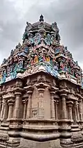 The temple is believed to be of significant antiquity and is believed to be initiated by the Medieval Cholas of the late 9th century CE, with later contributions at different times from Thanjavur Nayaks. The temple has three inscriptions dating from the Chola period. The temple has a five-tiered rajagopuram (gateway tower) and enshrined within a granite wall. The complex contains all the shrines and the temple tank is located outside the main entrance of the temple.