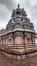The temple[4] has a 5-tier rajagopuram and a vast temple complex. The prime deity, Bhaktavatsalar has an imposing image. The temple tank is situated right opposite to the temple and is considered one of the largest temple tanks in the state. This shrine is also referred to as Saptamrita Kshetram (seven celebrated elements of nature), referring to seven of its elements such as Vimanam, Mandapam, aaranyam, tirtham, kshetram, river and town.[2] The main entrance of the temple faces the East and at the entrance of the temple, there is a four pillared open hall. The temple has a 90 ft (27 m) tall rajagopuram (temple tower) and is enclosed by rectangular walls around it. There is a smaller temple tower on the western side. The walls of the temple is surrounded by large streets, through which the temple chariot passes along during festivals. A rare image of Buddha, image of Vaikunta Natha and Vishnu mounted on his eagle mount Garuda are the major images in the temple. There is a pillared hall leading to the shrine of Kannamangai Thayar shrine that has pillars with Nayak architectural representation.[2]