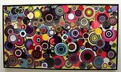 Bharti Kher has worked in a variety of media creating paintings, sculptures, installations, and text.[5][9] Kher's primary material is manufactured versions of traditional Indian bindi.[10][11] Throughout her career Kher has kept some repeating patterns in her paintings from her student years from the late 1980s to the early 1990s.[12] Kher considers how the realities of human life is perceived in our current time.[13] Her works displays fondness towards human drama, as well as intrinsic love.[12]