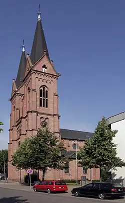 The plans for the current church were drawn up by the then Grand Duchy of Hesse district building master Christian Horst. He designed the church as a “neo-Early Gothic”, three-naved column-borne basilica with quire and transept on the model of the Elisabeth Church in Marburg.[3]