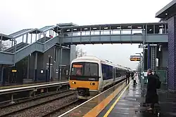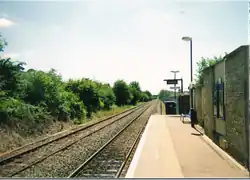 The Buckinghamshire Railway, which already had a route between Bletchley and Banbury, had powers to build a line to Oxford. The first part of this line, which ran from a junction to the west of Winslow (at a point which became known as Verney Junction) to Islip, opened on 1 October 1850, and this included a station at Bicester.[2][3] (At its maximum extent, the line extended from Oxford to Cambridge and thus became known as the Varsity line). Originally named "Bicester", the station was renamed "Bicester London Road" in March 1954,[3] although the nameboards were not altered until 20 September 1954.[4]