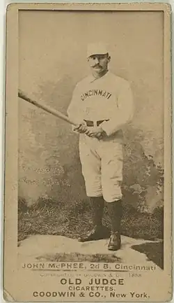 Born in Massena, New York, McPhee broke into professional baseball in 1877 as a catcher with the Davenport Brown Stockings of the Northwestern League.[2] He played for Davenport for three seasons, shifting to second base during the 1879 season.[2] After not playing baseball in 1880, he joined an independent team in Akron, Ohio in 1881.[2] Before the 1882 season, he signed a contract to play for the Cincinnati Red Stockings, a team in the newly formed American Association.[3]