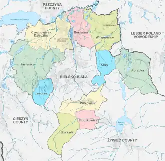 Bielsko County (Polish: powiat bielski) is a unit of territorial administration and local government (powiat) in Silesian Voivodeship, southern Poland. It came into being on January 1, 1999, as a result of the Polish local government reforms passed in 1998. Its administrative seat is the city of Bielsko-Biała, although the city is not part of the county (it constitutes a separate city county). The county contains three towns: Czechowice-Dziedzice, 13 km (8 mi) north-west of Bielsko-Biała, Szczyrk, 14 km (9 mi) south of Bielsko-Biała, and Wilamowice, 12 km (7 mi) north-east of Bielsko-Biała.