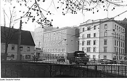 In 1923, work began on raising the railroad in the Plauen area, which was completed in 1927. This prompted the Bienerts to reorganize transportation between the two mills, which until then had been by horse-drawn wagon and time-consuming railroad trips. In the same year, tram tracks were laid in the yards of both the Bienertmühle and the Bread Factory (as well as a connection from Magdeburger Straße to the Hafenmühle), and from that point on, transportation was also provided by tram cars.[67] In 1926, the Dresden tramway took into service a rebuilt freight car and three rebuilt freight trailers, which were used exclusively for transporting grain and flour between the two mills and the bread factory, and were approved for 15 tons of freight each. These tram transports with their distinctive white paint and Bienert lettering continued until the early 1960s.[68] From Altplauen Street, the entrance to the Bienertmühle yard was directly behind the bridge over the Weißeritz River, which is still visible with remnants of the tracks; immediately after the railroad bridge, the tracks branched off to the bread factory. Most of the track remains were removed in the 1990s, but short sections of track can still be seen in the yard.[67]