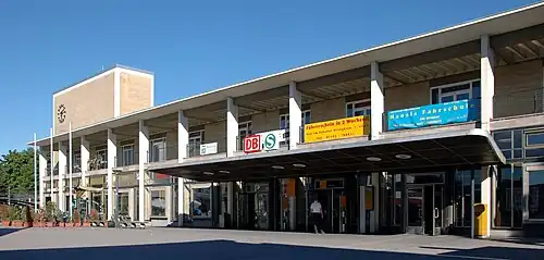In 1958, construction began on the new reception building and it was inaugurated on 27 June 1961. Helmuth Conradi, who also designed the new Heidelberg Hauptbahnhof, planned it as a two-story building with a one-story annex. The station's roof extends to the right and left of the lobby and connected to a four-story tower with a clock, which appears to be part of the same building. The windows of the entrance building emphasise its concrete skeleton. In the tower and on the upper floor there are offices. The previous buildings still remained at first and were later demolished.[7]