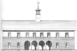 The first station building of the Rundbogenstil ("round arch style"), which was common at the time, was probably designed by Michael Knoll. It had two stories and a tower with a clock and two bells. The eight vault construction was probably built of stone. On the 1st floor there was a cornice at the height of the window sills. It had a continuous gable roof and a clear horizontal division between the ground and first floor. In the centre there was a four vault central hall, accented by the bell tower. The station building of 1847 had on the ground floor two waiting rooms, an office for the stationmaster, a cash room, a luggage room and a staff room. On the 1st floor there were apartments for rail personnel.[5][6]