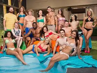 Following these events, Howard, Jeremy, McCrae, Nick, and Spencer formed the "Moving Company" alliance.[24] HouseGuests later split into three teams to compete in the "Cooler and the Gang" Have-Not competition.[17] For this competition, HouseGuests were required to swim across the backyard and grab cans in an attempt to stack them in the shape of a pyramid; while a HouseGuest was doing this, their teammates were required to hold the cans up on a stand, and were required to start over if their pyramid fell.[25] The team of Andy, Elissa, Helen, Howard, and Judd were the Have-Nots for the week.[26] On Day 5, McCrae nominated Candice and Jessie for eviction, feeling as though they were the least liked people in the house.[27][28] Despite this, McCrae and his alliance hoped to backdoor Elissa, fearing her due to her relation to Rachel Reilly.[29] Elissa later became the first "Big Brother M.V.P." of the season.[30] On Day 7, Elissa nominated David for eviction.[31][32] When picking players for the Power of Veto competition, Elissa and Howard were selected to compete. That night, HouseGuests competed in the "Big Brother Baking Competition" Power of Veto competition.[33] For this competition, HouseGuests were required to crawl through a pool of honey to get to various blueberries. HouseGuests had to pop the blueberries to find the letters inside, and then attempted to spell the biggest word with the letters they found; the HouseGuest with the longest, correctly spelled word would win the Power of Veto.[34] McCrae was the winner of the Power of Veto.[35] On Day 9, McCrae used the Power of Veto to remove Candice from the block, and chose to nominate Elissa in her place.[36] Despite this, a plan was set in motion by Amanda, McCrae, Andy, Judd, Spencer, Helen, Nick, and Howard to keep Elissa in the game and evict David.[37] On Day 13, David became the first HouseGuest to be evicted from the house when he received a total of seven eviction votes (7-5-0).[38][39][40]