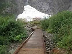 A severe autumn storm in November 2006 caused flooding of the South Fork Stillaguamish River destroying a major footbridge to the Big Four Ice Caves. Estimated repair costs to replace the damaged span were approximately $425,000, and repairs were completed in June 2009.[2] While the trail is open to the public, the snowfield itself was closed temporarily[3] due to cave-ins and slides which have killed four hikers in incidents in 1998, 2010, and in 2015.[4][5] Because of the danger, hikers are advised to stay out of the caves and are monitored by forest rangers.[6]