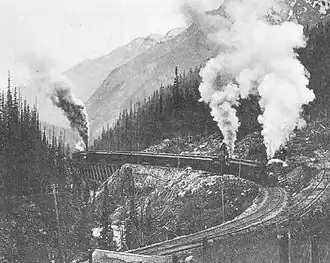 The Big Hill on the Canadian Pacific Railway main line in British Columbia, Canada, was the most difficult piece of railway track on the CPR's route.[1] It was in the rugged Canadian Rockies west of the Continental Divide of the Americas and Kicking Horse Pass. Even though the Big Hill was replaced by the Spiral Tunnels in 1909, the area has long been a challenge to the operation of trains and remains so to this day.[2]