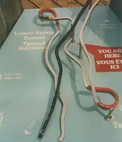 The route decided upon called for two tunnels driven in three-quarter circles into the valley walls. The higher tunnel, "number one", is 992 metres (3,250 ft) in length and runs under Cathedral Mountain, to the south of the original track. When the new line emerges from this tunnel it has doubled back, running beneath itself and 15 metres (50 ft) lower. It then descends the valley side in almost the opposite direction to its previous course before crossing the Kicking Horse River and entering Mount Ogden to the north. This lower tunnel, "number two", is 891 m (2,920 ft) in length and the descent is again about 15 metres. From the exit of this tunnel the line continues down the valley in the original direction, towards Field. The constructions and extra track effectively double the length of the climb and reduce the ruling gradient to 2.2%. The new distance between Field and Wapta Lake, where the track levels out, is 11+1⁄2 miles (18.5 km).[6]