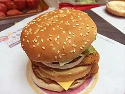 The new version of the sandwich was originally made with two of the chain's 1.7 oz (48 g) hamburger patties, but after negative consumer response regarding the size of the patties the sandwich was reformulated to use two 2 oz (57 g) Whopper Jr. patties instead.[33] A chicken variant was introduced in May 2014.[34] The new chicken variant swapped out the burger patties with two chicken patties used for the chain's value menu chicken sandwiches and added a third layer of sauce to increase the moisture content of the sandwich. The sandwich was introduced nationwide in the U.S. after a period of testing in Indiana. While the chicken version of the sandwich was new to Burger King, it again copied a product from McDonald's—in the Middle East the competing chain offers a Chicken Big Mac sandwich.[35]