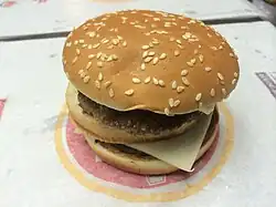 The sandwich that would eventually become the Big King was preceded by a similar sandwich called the Double Supreme cheeseburger.[4] Burger King's take on rival McDonald's well-known Big Mac sandwich was released as a test product in January 1996 when McDonald's was having difficulties within the American market.[4][5] Hoping to build on improving sales of Burger King and take advantage of perceived market weakness of McDonald's, the chain introduced the Double Supreme as part of an advertising blitz against its competitor. Originally, the burger had a look and composition that resembled the Big Mac: it had two beef patties, "King" sauce, lettuce, cheese, pickles and onions on a three-part sesame seed bun. Because its patties are flame-broiled and larger than McDonald's grill fried and seasoned patties, and the formulation of the "King Sauce" was different from McDonald's "Special sauce", the sandwich had a similar, but not exact, taste and different caloric content. The sandwich was reformulated after the initial test run, removing the center roll.[6] The Double Supreme was advertised with a direct attack on the Big Mac, using the claims that it had 75% more beef and less bread than the McDonald's sandwich. A review of the Burger King sandwich by the Chicago Tribune verified these claims and also stated that the ingredients of the newer sandwich were of better quality than those of the McDonald's product.[7]