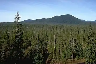 ![]() The forested slope in the foreground is part of the Big Lava Bed, a 0.9 cu km lava flow erupted from the cinder cone in the background about 8200 years ago. The lava flow traveled 13 km from the source crater and is the youngest feature of the Indian Heaven volcanic field. | |