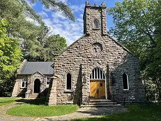 Big Moose Community Chapel is a historic chapel located on Big Moose Lake near Eagle Bay in Herkimer County, New York. The chapel was built in 1931, and is a modified "L"-plan Late Gothic Revival style church constructed of locally quarried granite. It has a cross-gable roof and features a small square belfry and pointed arch openings. It was built by master builder Earl Covey and incorporates Adirondack style architectural elements.[2]: 5