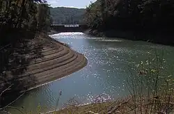 Civilian Conservation Corps Company 4495, which was originally based in Loyston, began work on Big Ridge State Park in October 1934. The CCC built several rustic cabins, the sandy beach, a lodge, and restored the c.-1825 Norton Gristmill.[12][13] TVA and the CCC constructed Big Ridge Dam during this period so that the park would have a lake area not affected by seasonal drawdowns of the Norris Reservoir.[14]