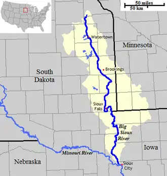 The Big Sioux River is a tributary of the Missouri River in eastern South Dakota and northwestern Iowa in the United States.[2] It flows generally southwardly for 419 mi (674 km),[3] and its watershed is 9,006 sq mi (23,330 km2).[1] The United States Board on Geographic Names settled on "Big Sioux River" as the stream's name in 1931.[4] The river was named after the Lakota people[5] which was known by them as Tehankasandata, or Thick Wooded River.[6]