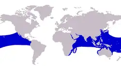 The bigeye trevally is widely distributed throughout the tropical and subtropical waters of both the Indian and Pacific Oceans.[11] In the Indian Ocean, it ranges from South Africa and Madagascar in the west, along the east African coastline up to both the Red Sea and Persian Gulf.[9] Its range extends east along India, South East Asia, Indonesia and many offshore Indian Ocean islands.[2] The range extends north to Japan and south to Australia[12] in this central Indo-pacific region. In the Pacific Ocean, the bigeye trevally inhabits most of the tropical island groups including Hawaii,[13] with its range extending east to the western American coastline. In this eastern region of its distribution it has been recorded from the American state of California in the north,[14] including the Gulf of California, and south to Ecuador and the Galapagos Islands.[11]