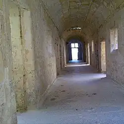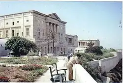 In 1829 four Egyptian limestone stelae, that pre-date the Phoenician period in Malta, were found on the site by British archaeologists.[13][14] Phoenician remains bearing inscriptions were also found that are now displayed at the British Museum.[15] On the request of the British Royal Navy to the Governor the site was handed over in 1830 to build the Royal Navy Bighi Hospital. The building was designed by the eldest son of Saverio Scerri.[16] The building cost roughly £20,000 and started operating in 1832. It accommodated 200 beds and it roughly gave service to 800 navy sailors per year. The design of Bighi Hospital is generally attributed to Colonel (later Major General) Sir George Whitmore (1775–1862) who headed the Royal Engineers between 1811 and 1829. The foundation stone was laid by Vice Admiral Sir Pulteney Malcolm on 23 March 1830. The works were completed on 24 September 1832, at a total cost of £20,000. The West and East Wings' architecture is in the modern Doric style and built with high floors. The hospital has three separate building and are known as Villa Bighi. It should not be confused with Villa Bichi, built in 1675.[7] The Surgical (also known as the General Hospital Block) and the Zymotic Blocks were built in 1901 and 1903 respectively.