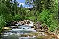 The Bighorn National Forest is a U.S. National Forest located in northern Wyoming, United States and consists of over 1.1 million acres (4,500 km2). Created as a US Forest Reserve in 1897, it is one of the oldest government-protected forest lands in the U.S. The forest is well east of the continental divide and extends from the Montana border for a distance of 80 miles (130 km) along the spine of the Bighorn Mountains, an outlying mountain range separated from the rest of the Rocky Mountains by Bighorn Basin. Elevations range from 5,000 feet (1,500 m) along the sagebrush and grass-covered lowlands at the foot of the mountains, to 13,189 feet (4,020 m) on top of Cloud Peak, the highest point in the Bighorn Mountains. Around 99% of the land is above 1,500 metres (4,900 ft).[3] The forest is named after the Bighorn River, which is partially fed by streams found in the forest. Streams in the range are fed primarily by snowmelt and snowmelt mixed with driving rainfall.[3]