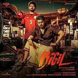 The soundtrack and background score was composed by A. R. Rahman, marking his second collaboration with Atlee after Mersal,[1] and also his fifth collaboration with Vijay.[1] The album features five songs with lyrics written by Vivek. The music rights of the film were acquired by Sony Music India.[2] Actor Vijay, sung one song titled "Verithanam" which was confirmed by a poster release on 8 July 2019. This is the first time Vijay, has sung for a film composed by Rahman.[3]