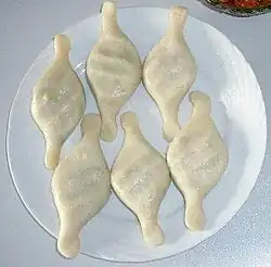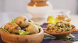 Bihari cuisine include litti chokha,[2] a baked salted wheat-flour cake filled with sattu (baked chickpea flour) and some special spices, which is served with baigan bharta,[3] made of roasted eggplant (brinjal) and tomatoes.[4][5] Dairy products are consumed frequently throughout the year, including dahi (yogurt), spiced buttermilk (known as mattha), ghee, lassi and butter.