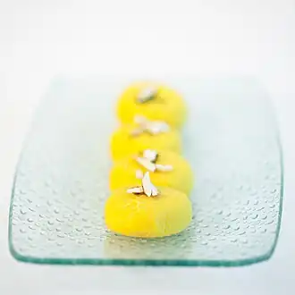 Malpua is a popular sweet dish of Bihar, prepared by a mixture of maida, milk, bananas, cashew nuts, peanuts, raisins, sugar, water, and green cardamom. Another notable sweet dish of Bihar is balushahi, which is prepared by a specially treated combination of maida and sugar along with ghee, and the well-known sweet khaja is made from flour, vegetable fat, and sugar. Silao near Nalanda is famous for its production. During the festival of Chhath, thekua[8], a sweet dish made of ghee, jaggery, and whole-meal flour, flavoured with aniseed, is made.[4]