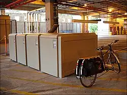 A bicycle locker or bike box is a locker or box in which bicycles can be placed and locked, usually 1 or 2 per locker. They are usually provided at places where numerous cyclists need bike parking for extended times (such as during the working day),[1] yet where the bikes might otherwise get damaged or stolen (such as at public bus terminals).