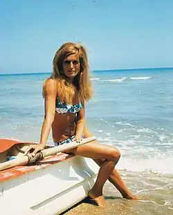 Increasingly common glamour shots of popular actresses and models on either side of the Atlantic played a large part in bringing the bikini into the mainstream.[95] During the 1950s, Hollywood stars such as Ava Gardner, Rita Hayworth, Lana Turner,[96][97] Elizabeth Taylor,[97] Tina Louise,[97] Marilyn Monroe,[97] Esther Williams, and Betty Grable[98] took advantage of the risqué publicity associated with the bikini by posing for photographs wearing them—pin-ups of Hayworth and Williams in costume were especially widely distributed in the United States.[37] In 1950, Elvira Pagã walked at the Rio Carnival, Brazil in a golden bikini, starting the bikini tradition of the carnival.[99]