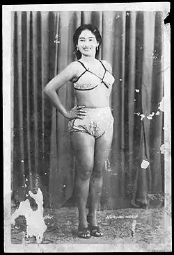 Soon after, Louis Réard created a competing two-piece swimsuit design, which he called the bikini.[55] He noticed that women at the beach rolled up the edges of their swimsuit bottoms and tops to improve their tan.[56] On 5 July, Réard introduced his design at a swimsuit review held at a popular Paris public pool, Piscine Molitor, four days after the first test of a US nuclear weapon at the Bikini Atoll. The newspapers were full of news about it and Réard hoped for the same with his design.[57][58] Réard's bikini undercut Heim's atome in its brevity. His design consisted of two side-by-side triangles of fabric forming a bra, and two front-and-back triangular pieces of fabric covering the mons pubis and the buttocks, respectively, connected by string. When he was unable to find a fashion model willing to showcase his revealing design,[59] Réard hired Micheline Bernardini, an 18-year old nude dancer from the Casino de Paris.[60] He announced that his swimsuit, was "smaller than the world's smallest bathing suit".[61][62] Réard said that "like the [atom] bomb, the bikini is small and devastating".[63] Fashion writer Diana Vreeland described the bikini as the "atom bomb of fashion".[63] Bernardini received 50,000 fan letters, many of them from men.[8][37]