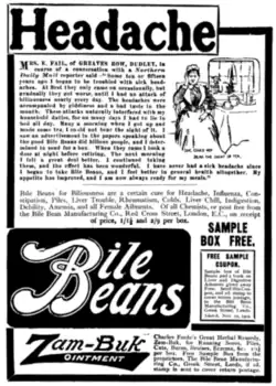 - ^ "Bile Beans for Biliousness", Sheffield Evening Telegraph, no. 4156, p. 5, 12 October 1900 – via British Newspaper Archive