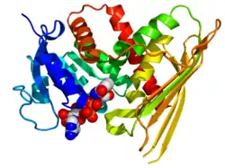 ![]() Crystallographic structure of human biliverdin reductase A based on the PDB: 2H63 coordinates. The enzyme is displayed as a rainbow colored cartoon (N-terminus = blue, C-terminus = red) while the NADP cofactor is displayed as space-filling model (carbon = white, oxygen = red, nitrogen = blue, phosphorus = orange). | |||||||