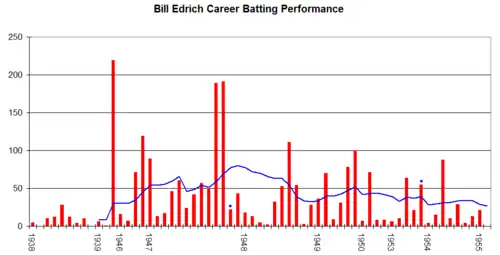 All told, Edrich played in 571 first-class matches between 1934 and 1958, scoring 36,985 runs, with a highest score of 267 not out. His run total puts him 29th on the all-time lists. He scored 2,440 runs for England in his 39 Test matches, with the 219 not out at Durban his best.[2] A professional before the Second World War, he turned amateur afterwards and captained Middlesex jointly with Compton in 1951 and 1952, continuing in sole charge from 1953 to 1957. After retiring from Middlesex, he returned to Norfolk and played Minor County cricket until he was 56, captaining the county until 1971.[2]