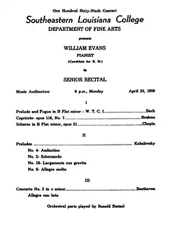 After high school, in September 1946, Evans attended Southeastern Louisiana College on a flute scholarship.[19][20] He studied classical piano interpretation with Louis P. Kohnop, John Venettozzi, and Ronald Stetzel.[21] A key figure in Evans's development was Gretchen Magee, whose methods of teaching left a big imprint on his compositional style.