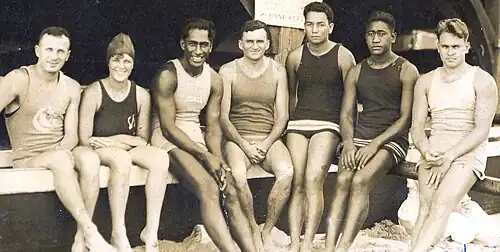 Hawaiians who qualified for the 1920 Olympic try-outs shown left to right: Ludy Langer, Helen Moses, Duke Kahanamoku, Dad Center, Warren Kealoha, Pua Kealoha, and Bill Harris.[9]