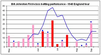 During the tour, Johnston had few opportunities with the bat, invariably batting at either No. 10 and No. 11 alongside Toshack, another tail-ender with little batting ability.[Stats note 1] Neither player ever passed 30 in their first-class career,[115] and they were the only two Australians who failed to pass 50 during the tour.[98] As Australia's other frontline bowlers were Miller, Lindwall, Colin McCool, Ian Johnson and Doug Ring, all of whom scored centuries and more than 20 fifties each during their first-class career,[116] Toshack and Johnston were rooted at the bottom of the batting order. As Australia often won by an innings, and declared in the first innings many time due to their batting strength, Johnston only had 18 innings in his 21 first-class fixtures and scored 188 runs at 18.80, the third lowest average and aggregate. He scored 62 runs in the Tests at 20.66, including his highest first-class score of 29 in the Second Test at Lord’s.[8]