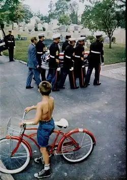 In 1965 Life sent Ray to Asia to cover the war in Vietnam and tensions on the border between Tibet and Sikkim. The cover for August 6 showed the six-inch guns of a light cruiser bombarding Vietcong positions and a photo essay in that issue showed action on an aircraft carrier, including a two-page spread of sailors transferring a 2,000 lb bomb that had been received from a supply ship and another showing crew members from a destroyer checking out a suspicious fishing boat.[3] In October of the same year, Ray was in Sikkim to photograph Chinese Red Army soldiers patrolling the Tibetan border of that Indian province.[17] In 1966 Ray produced a photo essay in a small Ohio town from which a relatively large number of young men had been sent to fight in Vietnam. It included shots of a military funeral for a marine killed in action (shown at right) and photos of six families, standing next to their television sets, each set showing President Lyndon Johnson giving a press conference. In varying degrees they expressed doubts about the war and, as the accompanying text said, "doubted Johnson's optimistic appraisal of Vietnam."[18] Before going to Massillon Ray made a photo essay showing the Watts section of Los Angeles as a follow-up to the previous summer's riots.[19] In 1968 Ray was in Prague taking photographs of the Soviet invasion that brought the Prague Spring to an end.[20] One of the images appeared in a double-page spread in the issue for August 30 (shown at left). The accompanying description said, "Suddenly, unbelievably, Soviet tanks were in the streets of Prague, and the brief idyll of liberation, the brave rebirth of national pride and expectation were at an end... Utterly astounded by the treachery and admonished by their leaders to offer no resistance, the Czech people could only gather with their flags in anguished crowds and hurl threats and a pitiful defiance against the steel of the invaders."[20]