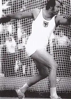In total, Tancred represented Great Britain 55 times. He competed at the 1968 and 1972 Summer Olympics in the discus, and was also selected for the shot put event in 1972 but a shoulder injury prevented him in competing.[9] Bill Tancred also took part in three Commonwealth Games in 1966, 1970, (where he achieved the bronze medal) and 1974 (where he achieved the silver medal). He also competed at the 1966, 1969 and 1971 European Championships.[8] Domestically, he set the British discus record on nineteen occasions. He was seven times the AAA Champion having won the AAA discus title from 1966 to 1970 and 1972–1973.[10] His mark of 64.94m in 1974, set in Loughborough on 21 July 1974, was his personal best but his British record was set after this in Woodford on 10 August 1974 at 64.32m. This remained the best thrown by a British athlete until Richard Slaney bettered it on 1 July 1985, in Eugene, Oregon, United States, although unofficially. Robert Weir officially broke the record in 1997.[5] Tancred remains sixth on the British all-time list for the discus. He also competed in the shot and remains one of the top ten British shot putters.[4] He won the British National Indoor (AAA) Championships for the shot in 1969 and 1976. Interestingly, he came 3rd in the AAA junior championships for the javelin in 1960.[11]