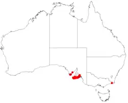 This species grows in mallee scrub and coastal heath on limestone and is endemic to the Mount Lofty and Port Lincoln areas and Kangaroo Island in south-eastern South Australia.[3][4][5]