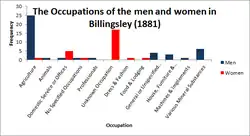 This is a chart showing the occupational structure of the parish of Billingsley in 1881 – comparing men and women. It gives a valuable insight into the village at this time. It uses the '24 orders' that were used for the original published reports in 1881 plus an 'unknown' category. From the chart, it can be seen that the majority of men worked in agriculture which suggests that it was a predominantly agricultural and working class village. From the graph it can be seen that there are more men working than women. However, there are more women than men working in domestic services or offices.[7]