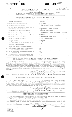 In 1915, during World War I, Butlin volunteered for service in the Canadian Army. Knowing that the army already had a full quota of despatch riders, Butlin intended to volunteer for service in that category in the knowledge that although his application would be declined he would still receive an "I volunteered" badge for his actions without having to serve. While applying, Butlin forgot to tell the recruiter of this intention, and was consequently allocated to the Canadian Expeditionary Force which was involved in the fighting along the Western Front.[n 7] He was subsequently posted to the 170th (Mississauga Horse) Battalion on 29 December 1915. His attestation papers give his date of birth as 1898 (rather than the actual 1899), allowing him to enlist at age 15. The papers give his occupation as a "Suit Case Maker". The papers also show, as Butlin himself later stated, that he had been selected to serve as a bugler.[w 3]