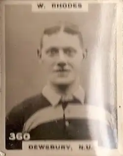William Rhodes (birth unknown – death unknown) was an English professional rugby league footballer who played in the 1910s and 1920s, and coached in the 1920s through to the 1950s. He played at representative level for England, and at club level for Dewsbury (two spells), as a wing, and later as a prop,[1] and coached at club level for Castleford.[4]