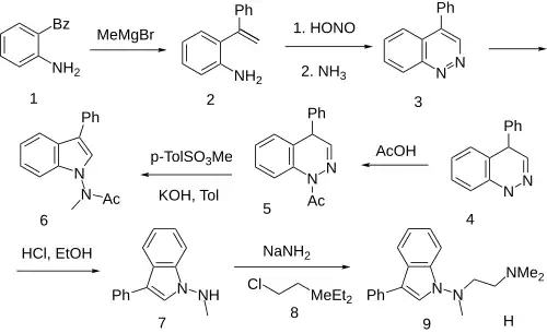 - ^ US 4204998, Schatz F, Stammbach C, Thiele K, Theodor W. Wagner-Jauregg, Zirngibl L, Fischer J, Jahn U, "N-Amino indole derivatives having pharmacological activity", issued 27 May 1980, assigned to Siegfried AG
