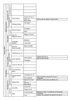 Tail-female pedigree: Young Miss by Young Jim - Miss Mambrino by Red Wilkes - Miss Clark by Alric - Kate by Clark Chief - Lida by Vandalxx.