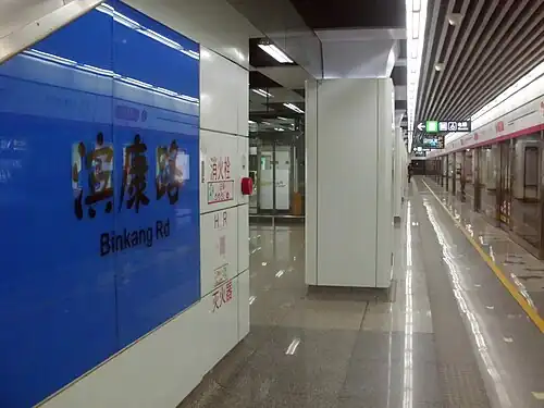 Binkang Road (Chinese: 滨康路) is a station on Line 1 and Line 5 of Hangzhou Metro in China.[1][2] It was opened in November 2012, together with the rest of the stations on Line 1. On April 23, 2020, it became an interchange station for Line 5 and Line 1. It is located in Binjiang District, Hangzhou.